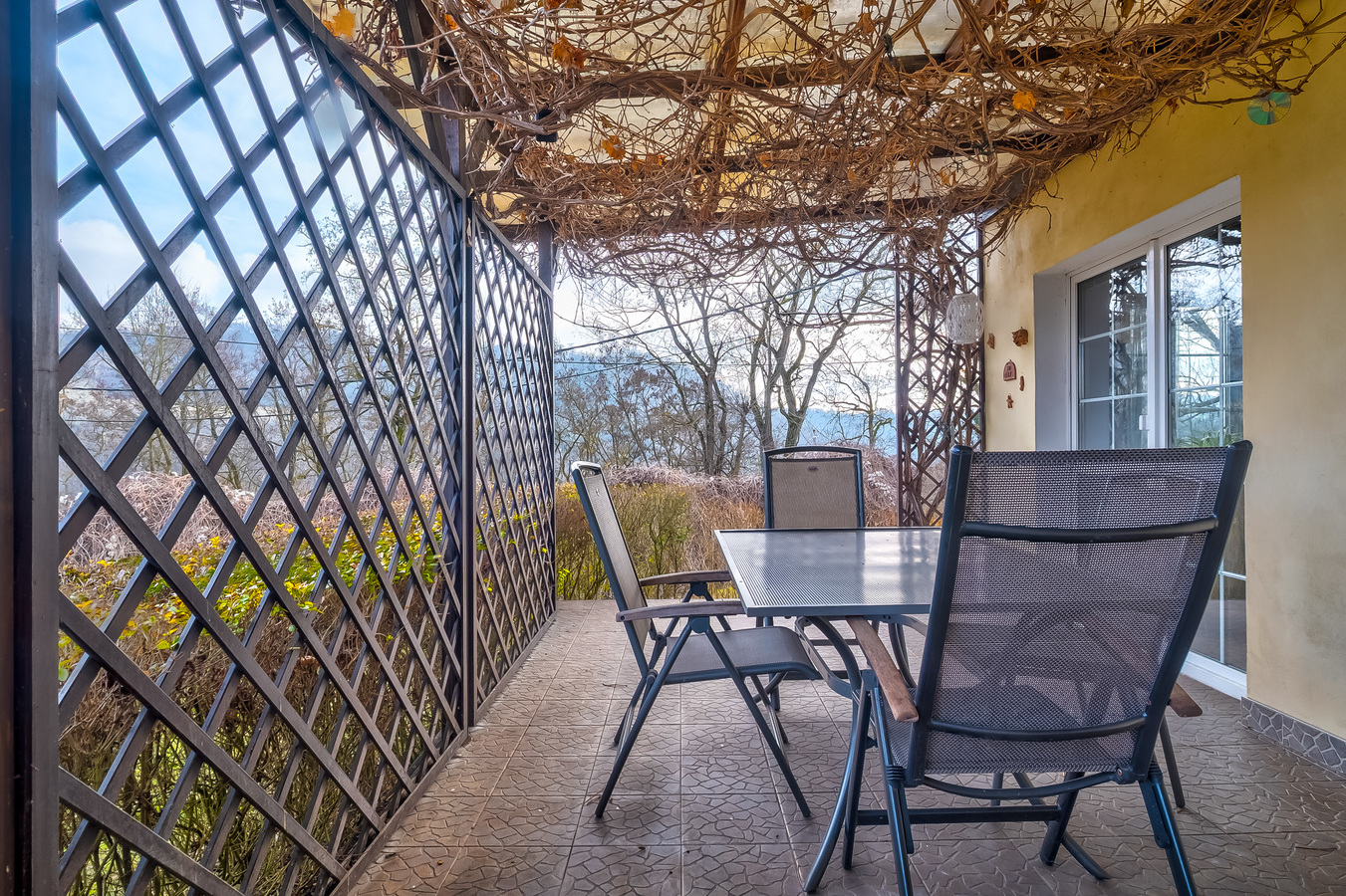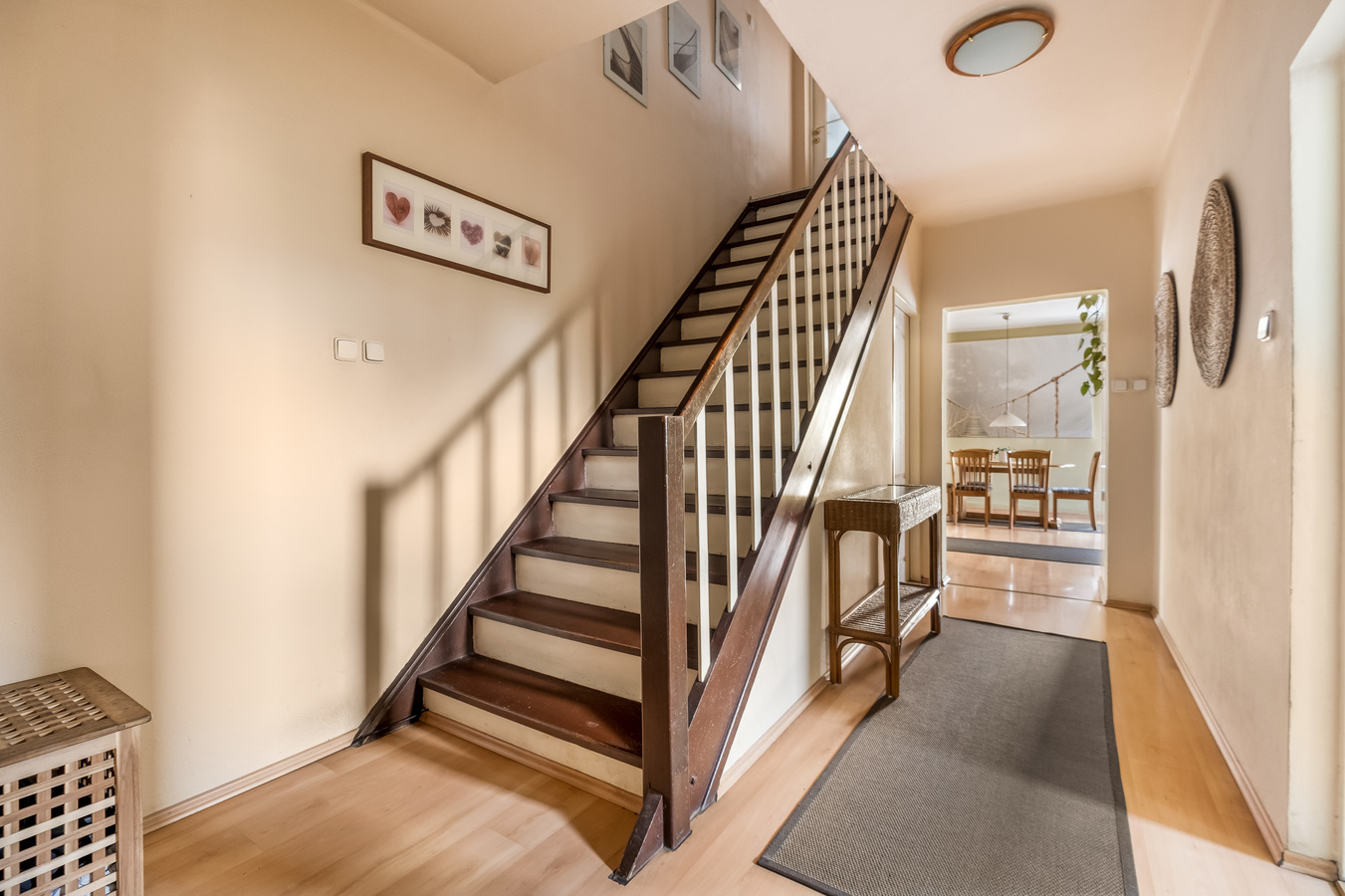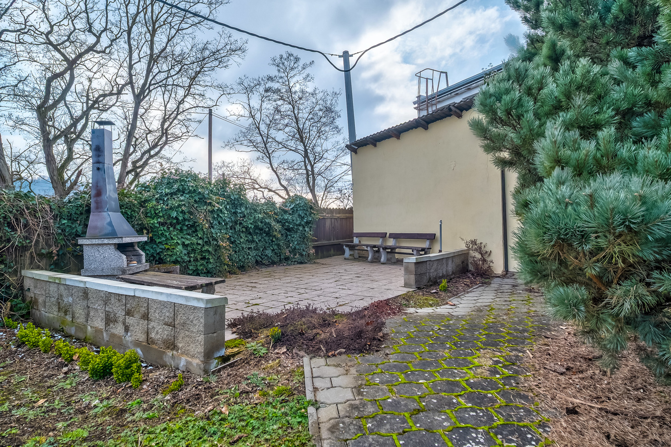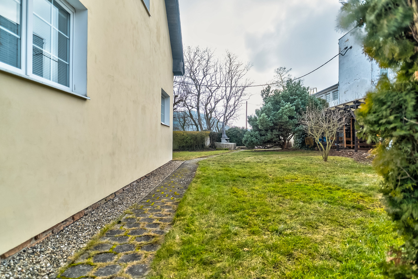 Patrový dům prošel v r. 2015 rekonstrukcí. Díky velkým oknům je interiér příjemně prosvětlený. Okna zároveň přirozeně propojují obytný prostor s rovinatou zahradou, kde se nachází bazén, prostorná terasa s výhledem na zámek a okolní krajinu a kryté parkovací stání pro dvě auta. Detailní dispozice domu je k dispozici v přiloženém půdorysu.